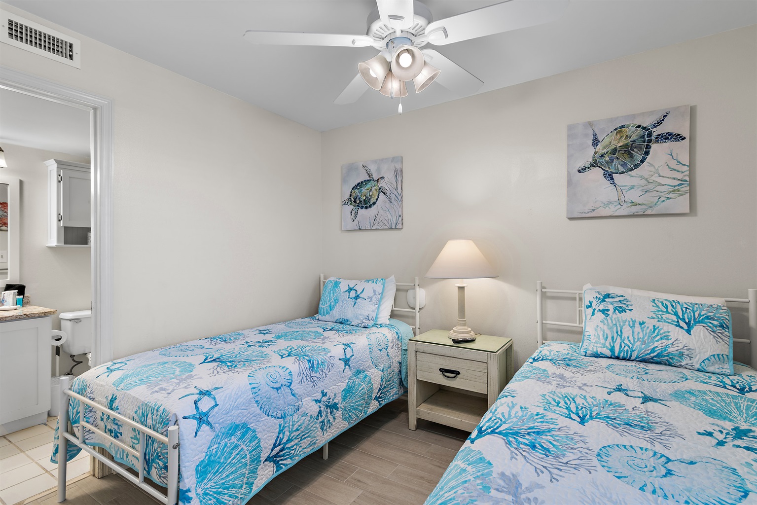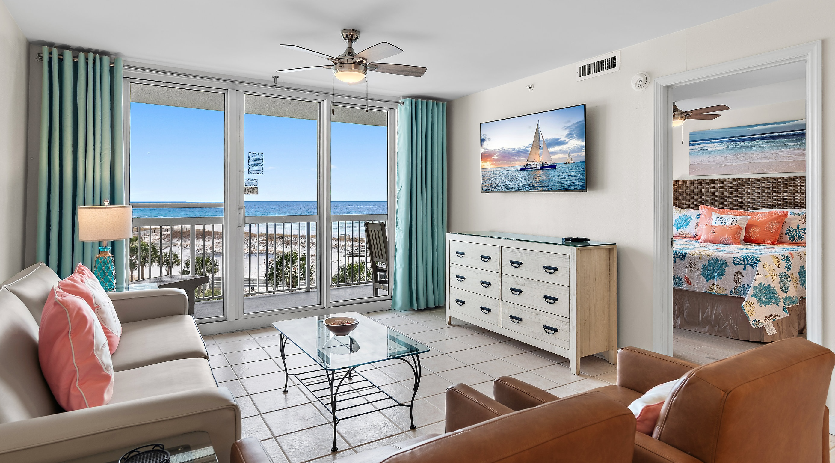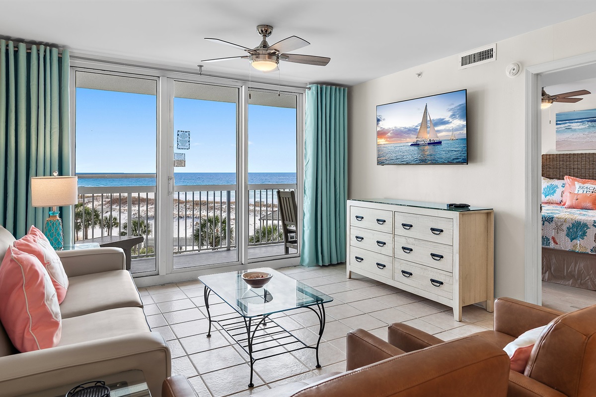 2 Bedrooms • 2 Bathrooms 2 Baths • Sleeps 1-6This beachfront unit is ideally situated on the 5th floor of the Pelican Beach Resort in Destin, offering our guests views of the white-sand beach and the emerald-green Gulf. Our condo blends coastal luxury with the comfort of home. It features a fully equipped kitchen with stainless-steel appliances, granite countertops, and all the kitchen essentials including cookware, tableware, and utensils. A washer and dryer are conveniently located inside the unit for your use. In addition to the king bed in the master bedroom, there are two twin beds in the guest bedroom and a queen sleeper sofa in the living room. The master bedroom includes a private ensuite bathroom with a tub and direct access to the balcony, while the guest bedroom connects to a second full bathroom with a shower. Each room is equipped with a Smart TV and cable access, and guests can enjoy high-speed Wi-Fi throughout the unit and resort.