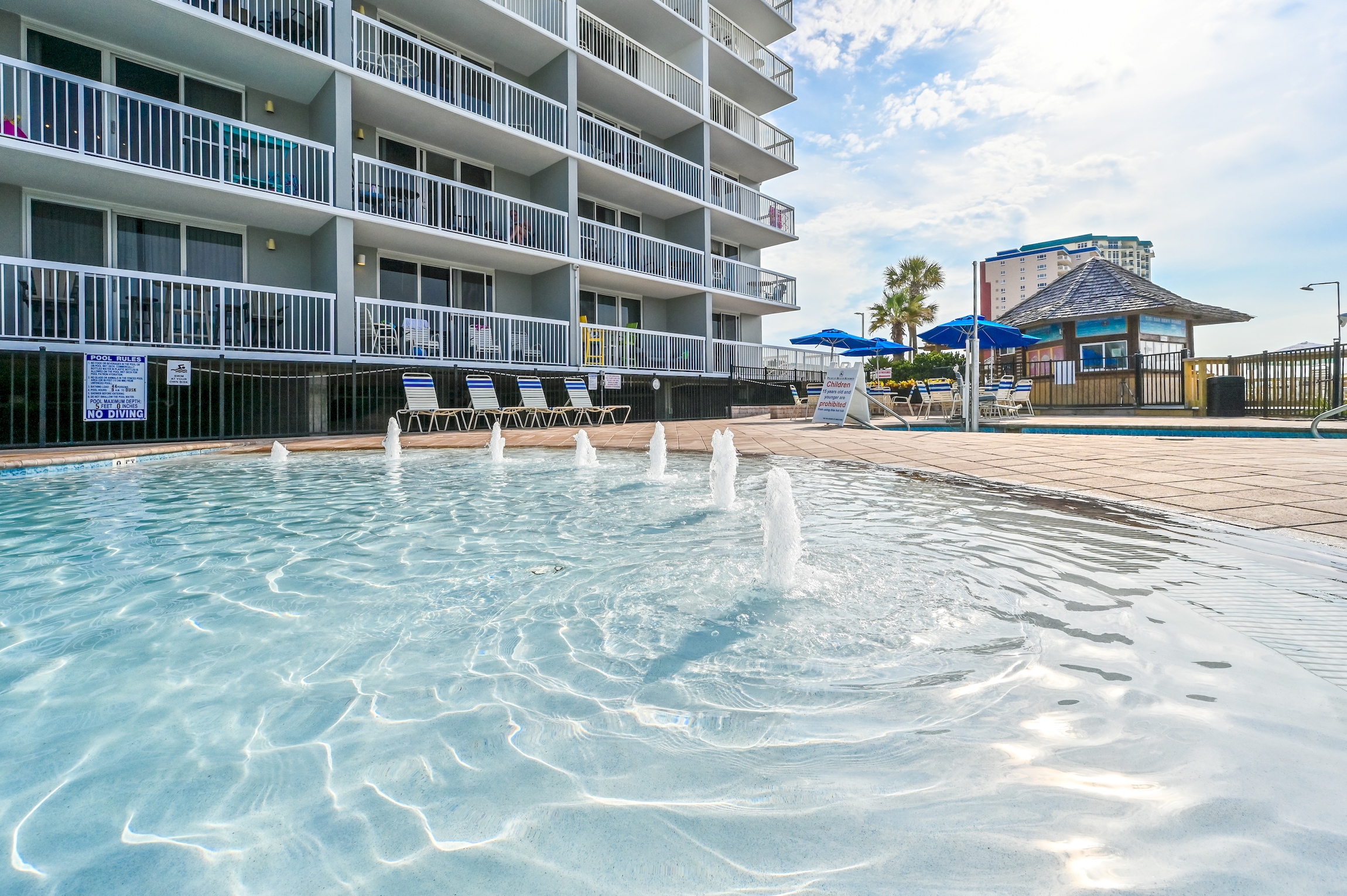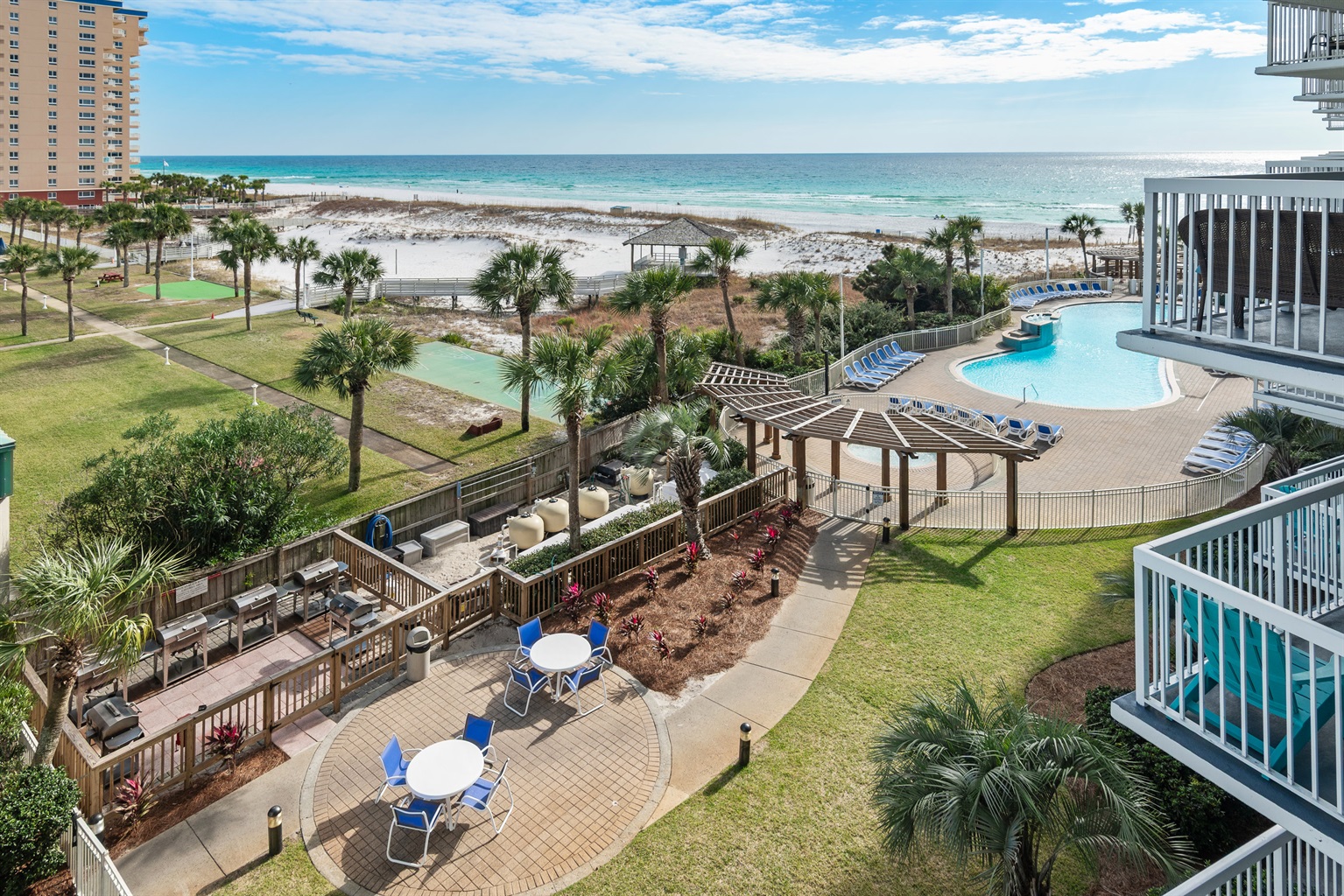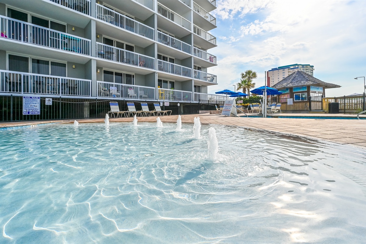 The pool area at Pelican Beach Resort features multiple pools, including three outdoor pools and one heated indoor pool for year-round enjoyment. Guests can also relax in one of the two hot tubs, unwind at the poolside Tiki Bar, or enjoy snacks and drinks from the on-site café and convenience store. The resort also offers a fitness center with sauna and steam room, tennis and pickleball courts, outdoor gas grills, and 24/7 front desk and gated security. Complimentary beach chairs, umbrella, and a cooler are provided for guest use, with additional beach service available seasonally.